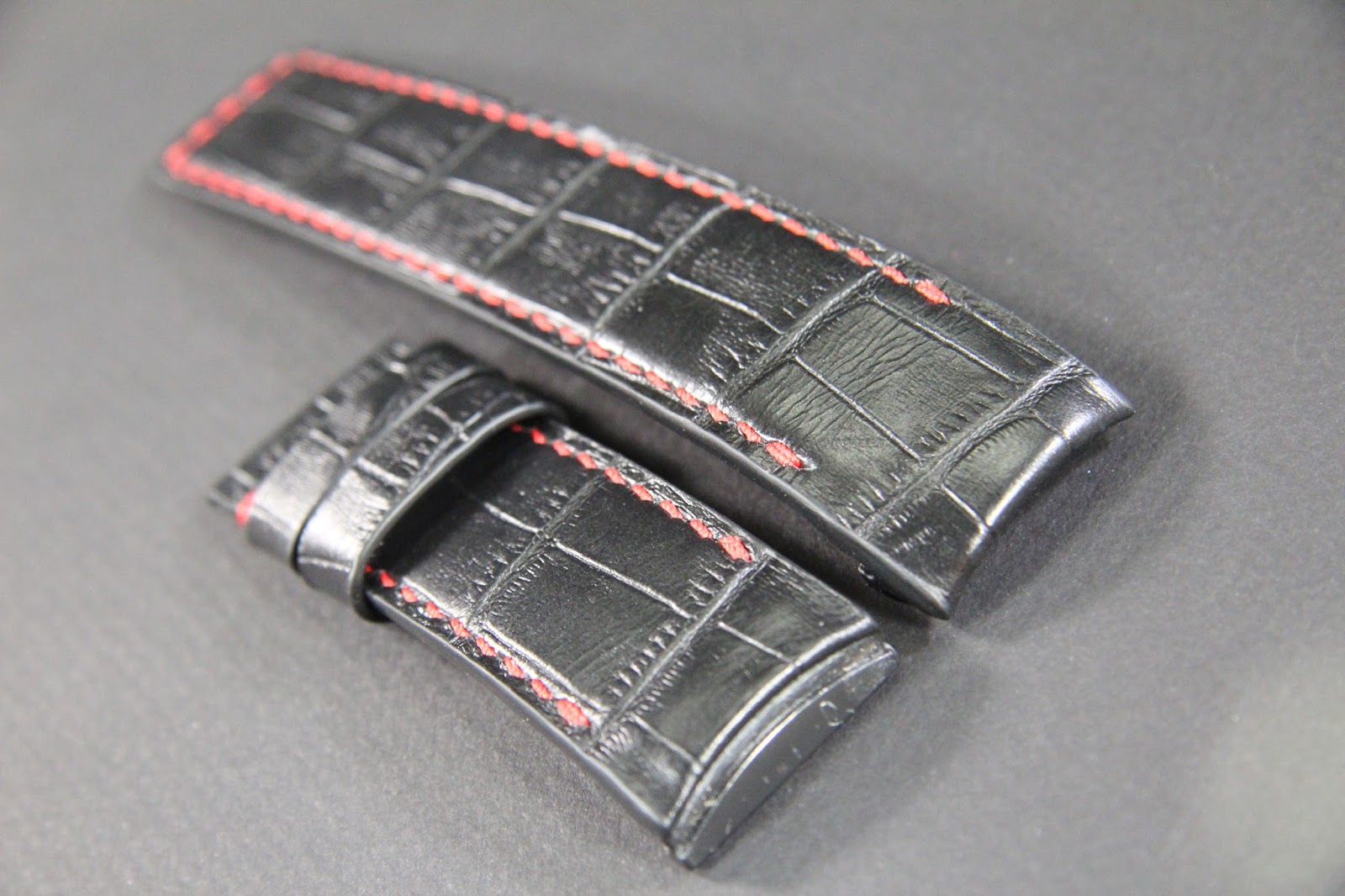 Custom-made watch strap of calfskin leather for Bomberg watch. The top strap is made of calfskin embossed alligator leather. Lining strap of calfskin leather. Transfer of plastic inserts into the base of strap. Strap hand stitched.