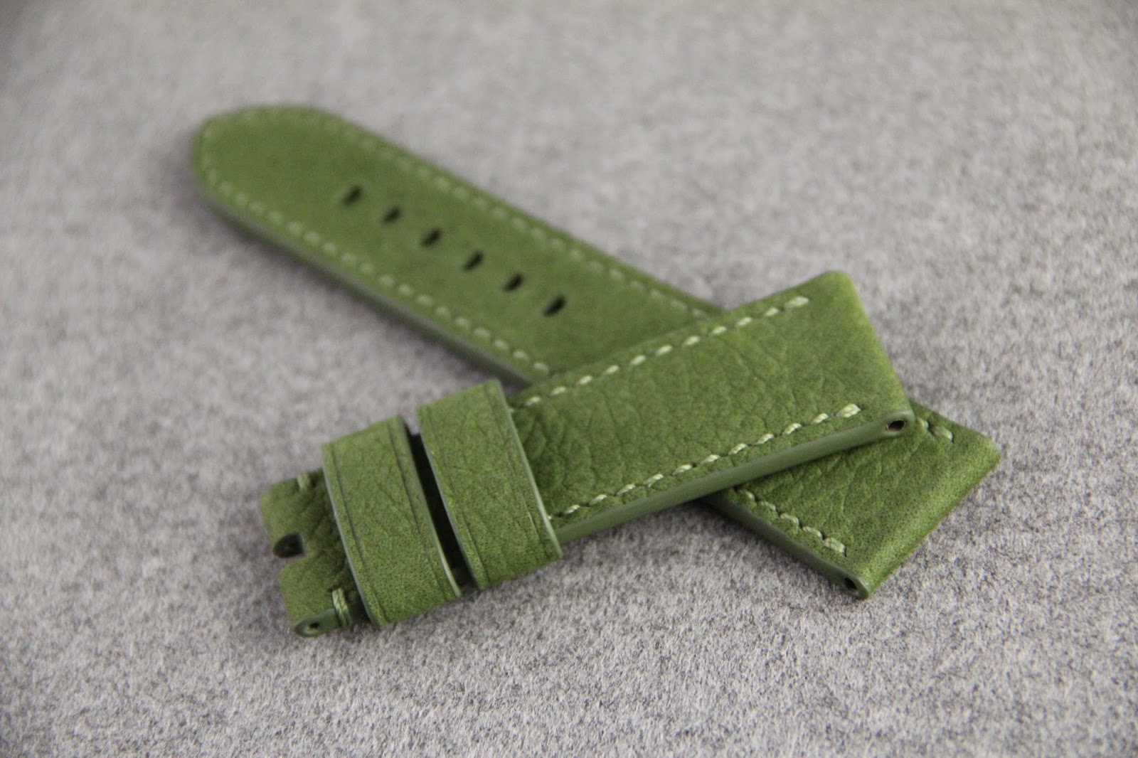 Сделанный на заказ ремень для часов Panerai PAM 390. Верх ремня сделан из кожи теленка нубук. Подкладка ремня из кожи теленка. Ремень прошит вручную.