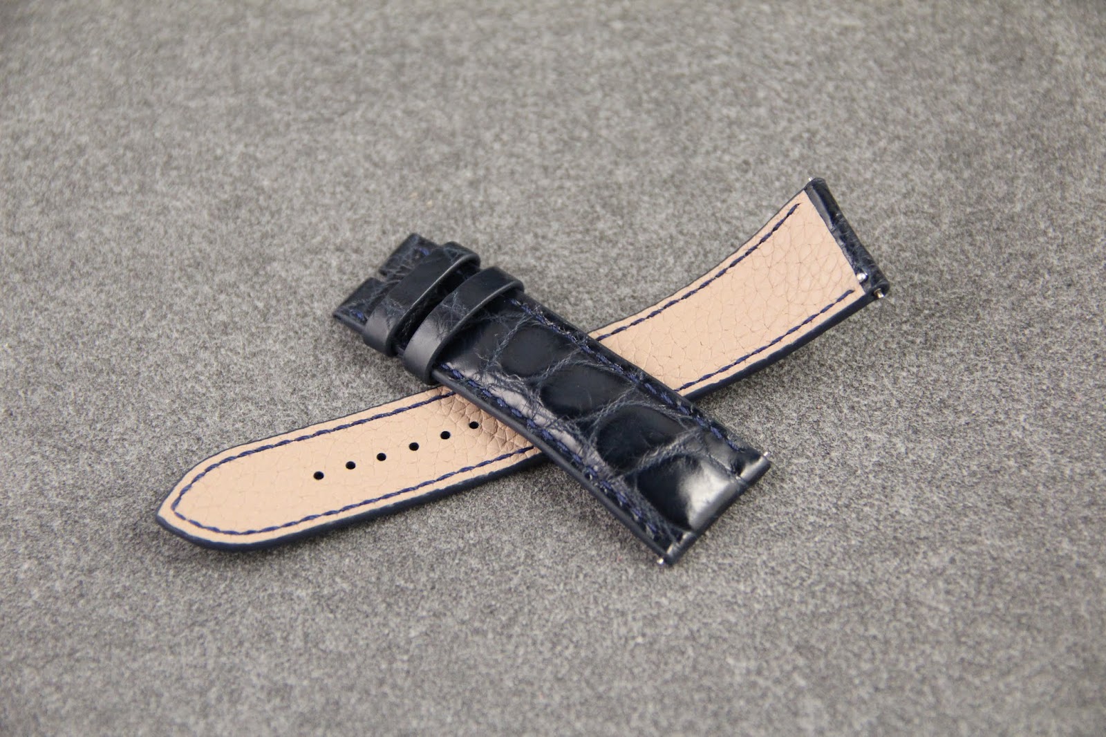 Custom-made watch strap of crocodile leather for Parmigiani Fleurier watch. The top strap is made of crocodile leather. Lining strap of calfskin leather. Spring bar for quick strap replacement. Strap hand stitched.