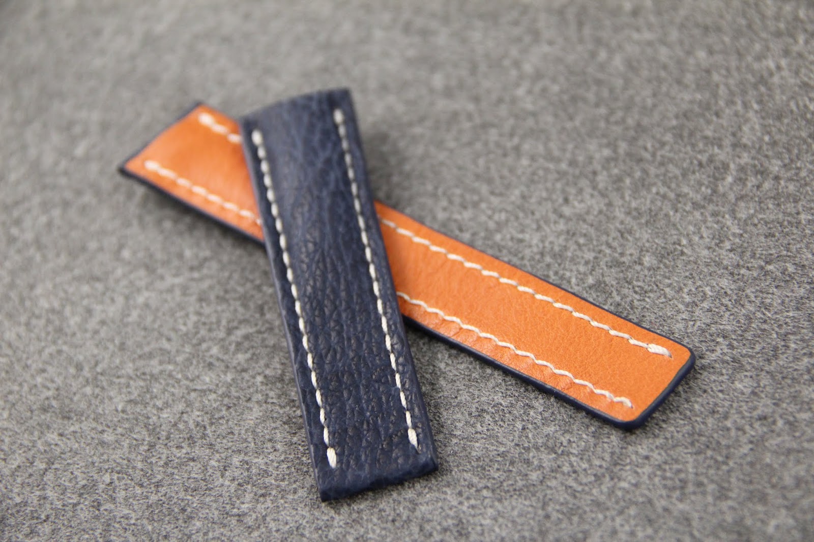 Bespoke watch strap of shark leather for Breitling Navitimer watches. The top strap is made of shark leather. Lining strap of calf leather. Leather produced at Curtiba Ind - Tuscany, Italy. Strap hand stitching.